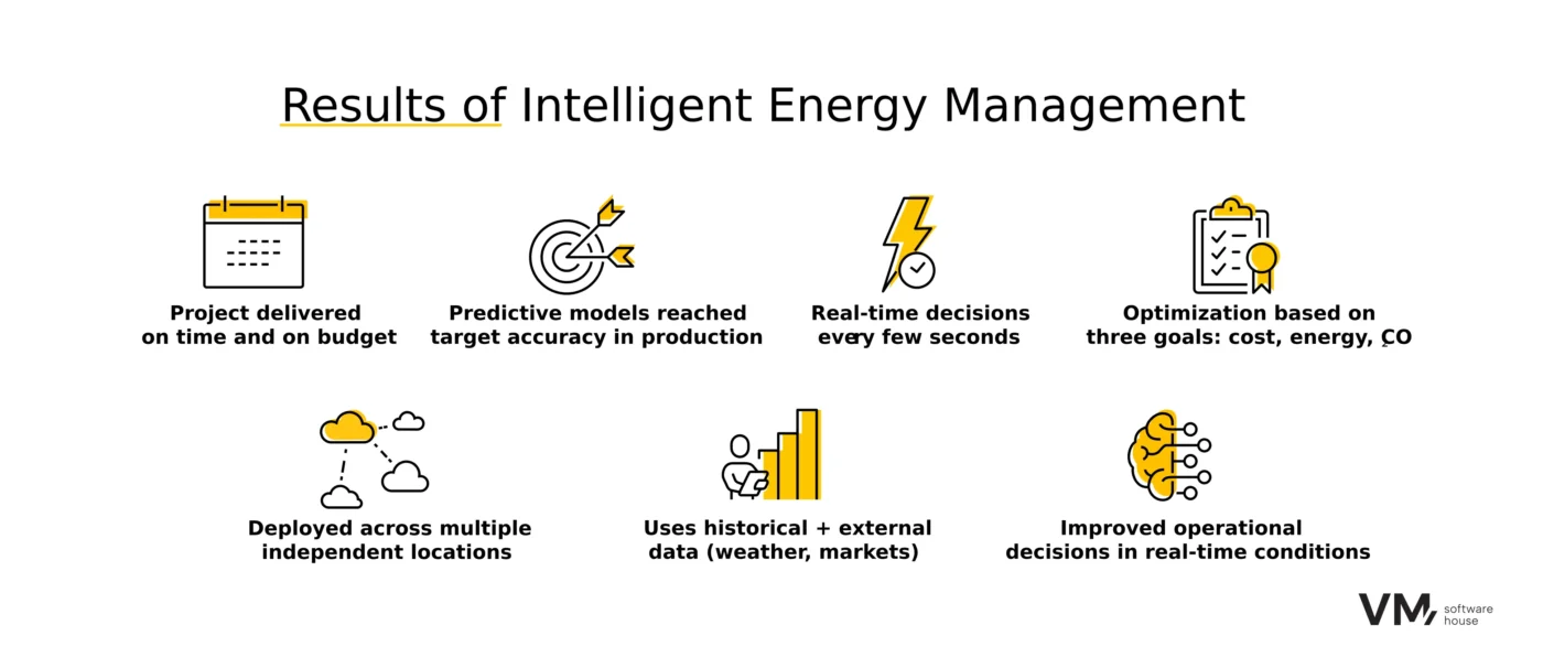 - Le système a considérablement amélioré la prise de décision en temps réel, permettant au client de réagir dynamiquement à l’évolution des prix de l’énergie, des conditions météorologiques et des profils de consommation.