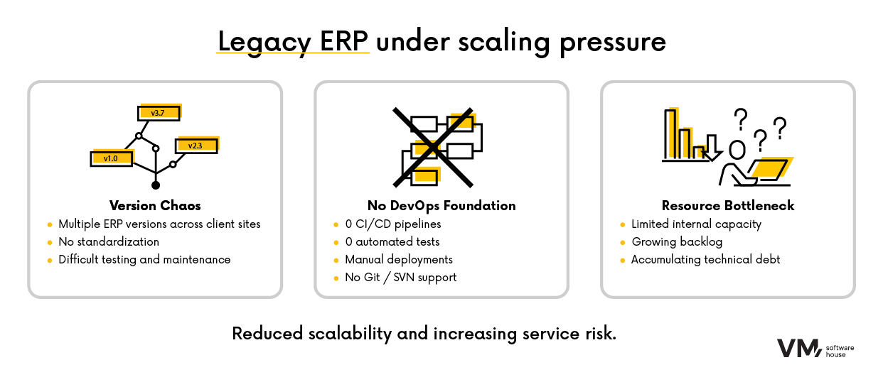 - Applications legacy empêchant l’utilisation d’outils modernes de gestion de version et d’automatisation comme Git ou SVN.