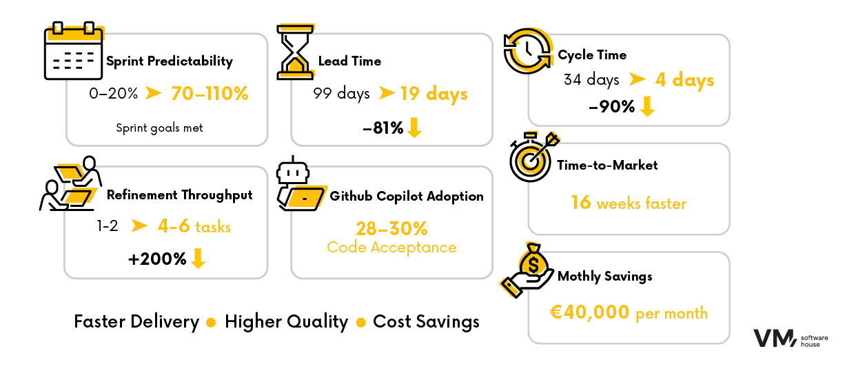 - La prévisibilité des sprints a été multipliée par plus de trois. Alors qu’auparavant seuls 0 à 20 % des story points planifiés étaient réalisés, après la transformation l’équipe atteignait régulièrement 70 à 110 % des objectifs de sprint.