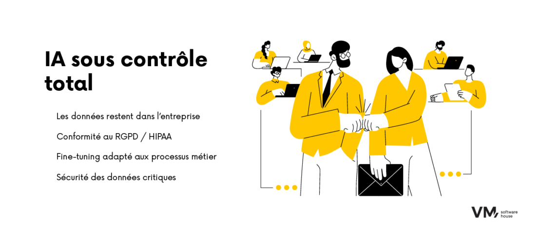 Leur plus grand atout réside dans la conformité aux réglementations (RGPD, HIPAA) et dans la possibilité de fine-tuning selon les processus métier. Ce choix est privilégié par les banques, les institutions publiques et le secteur médical – partout où la protection des données et la conformité sont prioritaires.